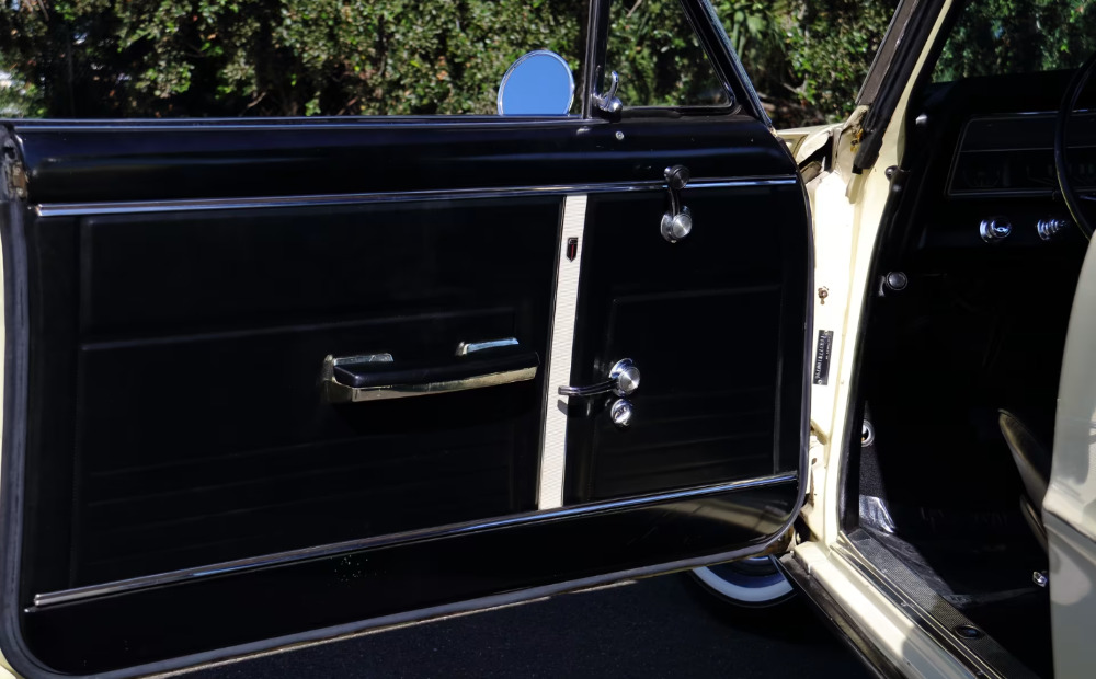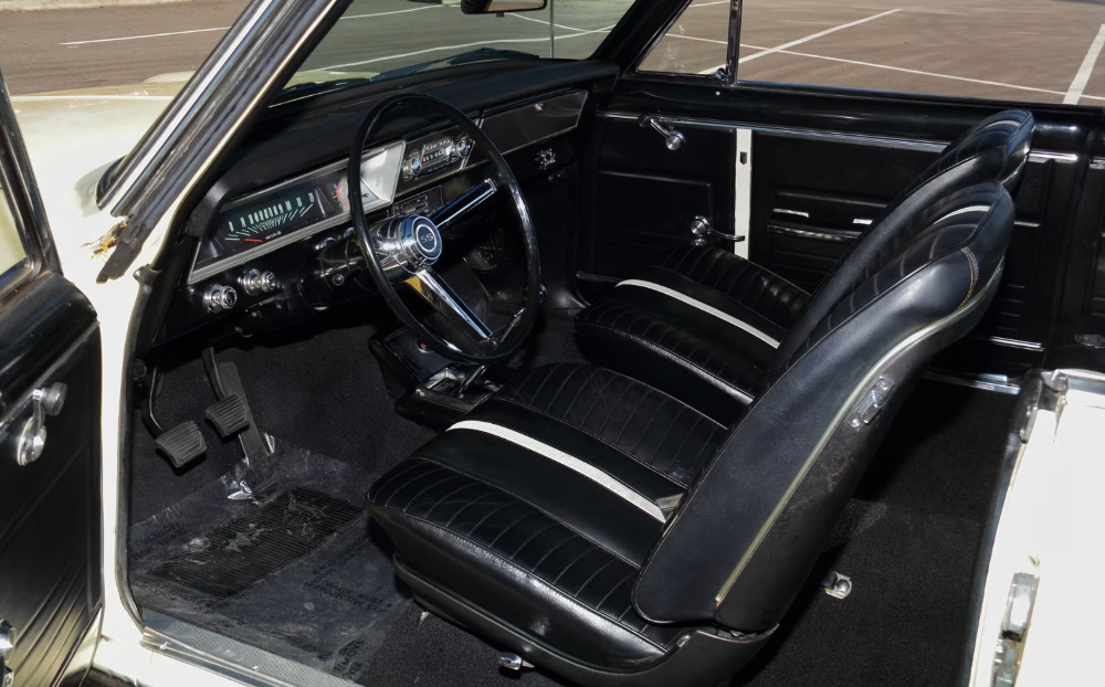 Inside, the Black interior with white accents remains clean and well-presented. Features include a push-button AM radio, deluxe front and rear seat belts, and tinted glass, all contributing to the car’s comfort and period authenticity.